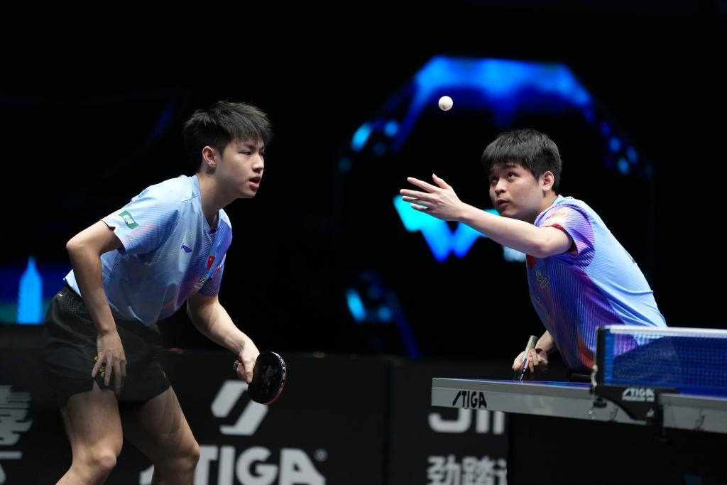 4月9日,林诗栋(右)/黄友政在比赛中。新华社记者 杨晨光 摄